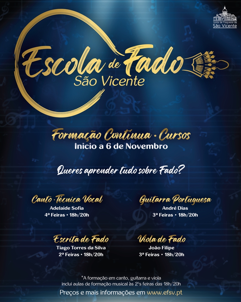 A Escola de Fado de São Vicente vai iniciar os Cursos de Formação Contínua a partir de dia 6 de novembro. Inscreve-te já em: www.efsv.pt