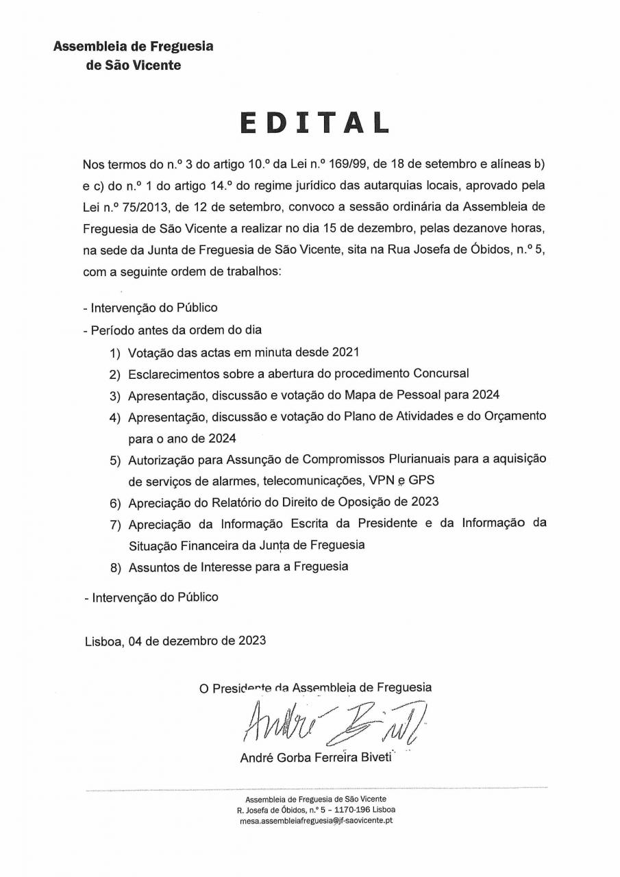 Informamos que se realiza uma sessão da Assembleia de Freguesia de São Vicente, no dia 15 de dezembro, pelas 19h, na sede da Junta de Freguesia de São Vicente, sita na Rua Josefa de Óbidos, n.º 5, com a seguinte ordem de trabalhos: