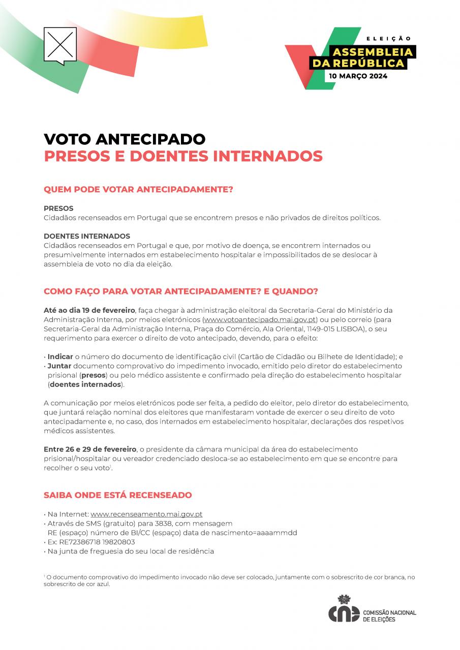 Informação relativa ao voto antecipado no âmbito da eleição da Assembleia da República: