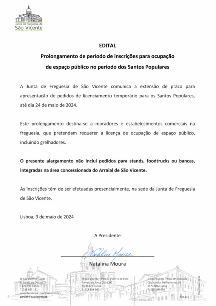 A Junta de Freguesia de São Vicente comunica a extensão de prazo para apresentação de pedidos de licenciamento temporário para os Santos Populares, até dia 24 de maio de 2024.