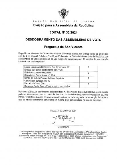 07-MAR-2024Eleições Legislativas - 10 março 2024Assembleia de Voto São VicenteBairro da Graça:- 1ª a 7ª Secção de Voto - Escola Básica e Secundária Gil Vicente (Rua da Verónica, nº37)Bairro de Santa Engrácia:- 8ª a 10ª Secção de Voto - Polo Clínico JF São Vicente (Calçada dos Barbadinhos, nº36 e nº36A)- 11ª e 12ª Secção de Voto - Centro Cultura Popular Santa Engrácia - (Calçada dos Barbadinhos, nº49)Bairro de São Vicente de Fora:13ª a 15ª Secção de Voto - Mercado de Santa Clara (Campo de Santa Clara - Entrada pela porta principal)Deverá consultar antecipadamente o seu local e seção de voto, através das seguintes formas:- Preenchendo o campo com o número de identificação e data de nascimento em https://www.recenseamento.mai.gov.pt/;- Enviando uma SMS para o 3838 (serviço gratuito) com a seguinte mensagem:'RE <nº de CC ou BI> <data de nascimento no formato AAAAMMDD> (exemplo: RE 12344880 19891007). A resposta é dada imediatamente.- Presencialmente na Junta de Freguesia ou Câmara MunicipalLinha de Apoio ao Eleitor pelo telefone: 808 206 206 (custo de chamada local).